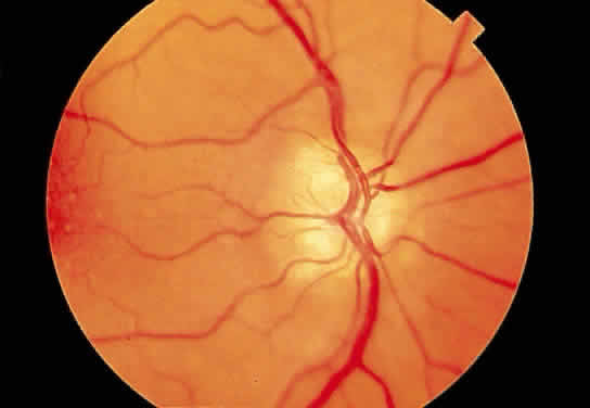 Reflection from the surface of the retina during ophthalmoscopy is attributable to the presence of a normal internal limiting membrane, a true basement membrane, secreted by the Müller cells. Loss of this reflection may indicate pathologic changes at the level of this structure (Fig. 3), such as a preretinal membrane (see Fig. 3). The color of normal retinal blood vessels depends on the composition of the blood column and the transparency of the blood vessel wall. The color of the normal vessels is altered in states of poor oxygenation (pulmonary diseases), extremely elevated lipid levels (lipemia retinalis) (Fig. 4), or opacification of the blood vessel wall, as seen in arteriolosclerosis (Figs. 5 and 6).