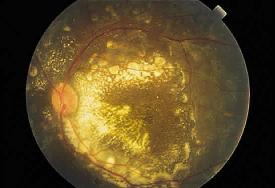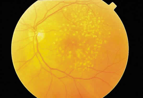 It is difficult to visualize calcification at the level of Bruch's membrane unless there is a focal disturbance in the distribution of melanin in the overlying pigmented epithelium. For example, the calcification of Bruch's membrane that occurs with age is not visible ophthalmoscopically when the pigment epithelium is intact. Parenthetically, it would be advantageous to detect this calcification because the brittleness that it induces in Bruch's membrane often leads to breaks in this barrier, creating an access path to the subretinal space by choroidal neovascular membranes in the pathogenesis of exudative (wet) macular degeneration.4 In the case of retinal pigment epithelial drusen, the presence of basement membrane material (the substance of the drusen) atop Bruch's membrane attenuates the overlying pigmented epithelium (Fig. 32), thinning out the normal distribution of melanin in these cells. Usually, these basement membrane deposits appear yellow-white (Fig. 33), but when they calcify, they may appear ophthalmoscopically as white, elevated dots.