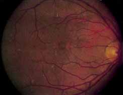 In the early stages of the dystrophy, the optic disc, retinal vessels, and peripheral retina are usually normal. The patient may have a visual acuity of 20/200 and normal color vision by standard testing and, yet, generalized cone dysfunction can be demonstrated by color field testing. In the late stages, there may be temporal optic disc pallor, attenuation of the retinal arterioles, and granular or bone spicule peripheral retinal pigmentary changes. Not infrequently, the peripheral pigmentary abnormalities may be regional. This probably reflects regional rod involvement, as evidenced by ERG, which may demonstrate a reduction in amplitude without a change in latency of the rod responses.72,80 At this stage, contracted peripheral fields may be found on both white and color target testing. No medical treatment is available. The prognosis for vision is guarded and poorer than for the other cone dystrophies because both cone and rod function is impaired in the macula and retinal periphery. Accordingly, central vision is decreased and color vision impaired in association with contraction of the peripheral visual fields. As the dystrophy progresses, vision may decrease to the 20/400 level or less and may also be accompanied by contracted peripheral fields and a total color defect. Patients with poor central vision should be referred to low visual aids. Severe photophobia in adults and children has been reduced with the use of appropriately tinted spectacles or contacts. The tint will often depend on the dystrophy as some patients with relatively well-preserved color vision require neutral tints and other more severely affected patients require red tints similar to those in rod monochromats. Miotic drops have been used in some patients with severe photophobia but are not generally well tolerated or advised. Ancillary Tests Fluorescein angiography demonstrates increased transmission of choroidal fluorescence in the macula during early phases of the study, without late leakage of dye or fluorescein staining. In addition, an annular pattern of hyperfluorescence is often seen in the macula, highlighting the bull's-eye pattern seen on fundus examination (Fig. 4). Visual field defects include central scotoma, peripheral field loss, and ring scotoma.