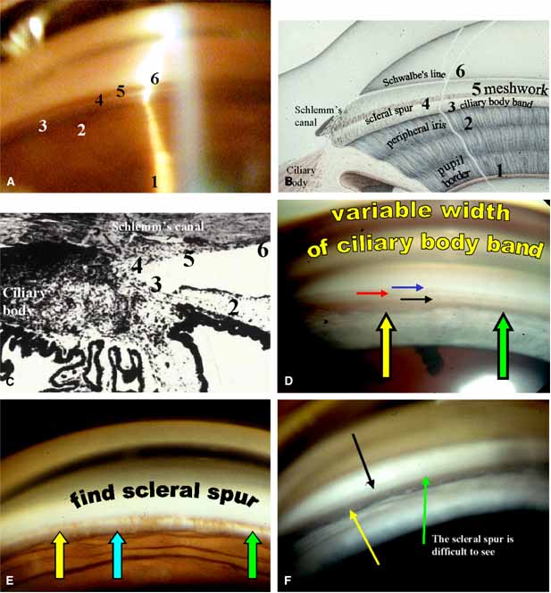 treatment based on gonioscopic findings. Gonioscopy requires a fusion of higher level skills including: hand–eye coordination, angle anatomy, physiology and pathophysiology of outflow structures and disease correlates, to name a few. There are several key landmarks that guide the gonioscopist through the iridocorneal angle in a systematic way; otherwise the angle loses its unique identity. The scleral spur is the visual landmark for maximum angle orientation. If the scleral spur is not located, suspect an abnormal angle or at least an unusual one. All outflow anterior to the spur is trabecular and the remaining uveoscleral outflow is posterior. Initially it is helpful to visualize the angle from a diagram that is correlated with a goniophotograph and then histophotograph (Fig. 3). Initially gonioscopy should be performed in every apparently normal eye until familiar with normal. Physicians who look at the angle daily will rapidly become proficient at differentiating normal from abnormal in a matter of seconds. Others who only look at the angle when abnormality is suspected will take much longer and may never become efficient gonioscopists. If possible, first find the scleral spur for rapid orientation. Then, to avoid confusion, observe the six structures in order from the iris to the cornea. If unable to find recognizable landmarks, look in another region of the angle. Pupil Border A scan across the chamber into the iridocorneal angle starts by looking for blood vessels, iris cysts, and dandruff-like particles in the pupillary border. If posterior chamber pathology such as misdirection, tumors, or cyclitic membranes is suspected, the pupil is dilated and gonioscopy repeated. The anatomy of the posterior chamber is easier to visualize with a gonioprism while the pupil is dilated. The fundus can also be viewed through the contact lens. Peripheral Iris Where the iris inserts onto the inner wall of the eye is identified, then the peripheral configuration of the iris is described and the angular approach of the iris to the cornea characterized. The peripheral iris may be flat, steep, or bow posterior; insertion is made anywhere from ciliary body to cornea with an angular approach of 0 degrees to 45 degrees. Ciliary Body Band The ciliary body band is that portion of the ciliary body muscle seen on gonioscopy (see Fig. 3D). The band is usually tan, gray, or dark brown, and typically narrow in hyperopes and wide in myopes. The root of the iris normally inserts onto the ciliary body band. If the iris inserts directly into the scleral spur, the ciliary body band is not seen easily. Scleral Spur The scleral spur is consistently the most notable landmark in the chamber angle (see Fig. 3E). Inability to locate the scleral spur is a cause for concern because obfuscation of the spur especially due to the peripheral iris is a tell tale sign of angle closure disease. The scleral spur appears as a white circumferential band. This white band represent the attachment of the ciliary body to the sclera and if found, the trabecular meshwork is directly anterior. The scleral spur separates conventional trabecular outflow from uveoscleral outflow and cyclodialysis clefts appear posterior to the spur. Trabecular Meshwork The trabecular meshwork extends from the scleral spur to Schwalbe's line and typically has a ground-glass appearance best seen with sclerotic scatter. Pigment in the meshwork usually accumulates in the posterior division and facilitates identification. However, any angle structure may accumulate pigment. The junction of the mid and posterior meshwork is the favored location for trabeculoplasty. When there is no pigment in the meshwork, the ground-glass appearance is essential to define the outflow system and the corneal optical wedge is helpful in delineating nonpigment outflow systems (best seen with the Goldmann gonioprism). Schwalbe's Line Schwalbe's line is the termination of Descemet's membrane and is the most anterior angle structure identifiable. Schwalbe's line marks the forward limit of the trabecular meshwork and is easily identified where the anterior and posterior reflections of the corneal optical wedge meet. |