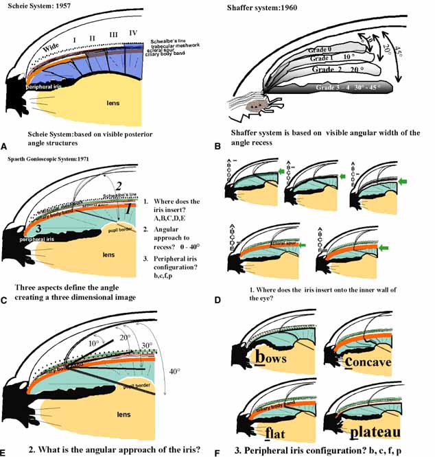 The Shaffer system is based on the width of the angle recess (see Fig. 10B and Table 2).21 The Spaeth nomenclature is a hybrid alphanumeric arrangement (see Fig. 10C to 10F).22 This system prompts the examiner to describe the angle in a three-dimensional manner. This allows total reconstruction of the angle by anyone who understands the nomenclature. For example, a grade IV Shaffer angle is wide open and a Spaeth D40p is also wide open. However, even though they are both wide open, the Spaeth system reveals a plateau configuration that requires closer scrutiny. Grade the following angles (Fig. 11). | |||||||||||||||||||||||||||||||||||||||||||||||||||||||||||||||||||||||||||||||||||||||||||||||||||||||||||||||