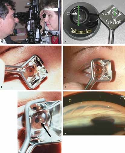 This is not meant to be an all-inclusive list, only a start. The point is that gonioscopy is underutilized and its use should be increased. Ophthalmologists often dictate instructions for diagnostic tests on return visits. Gonioscopy should be added to that list, especially with any of the elements noted on the above list. Physicians who train their technicians about gonioscopy will find it easier to integrate gonioscopy into their practices. Office-based Koeppe gonioscopy is no longer performed. The demands placed on busy ophthalmologists make this technique impossible to use in the office. However Koeppe gonioscopy is an unsurpassed method for viewing the chamber angle in the operating room (Fig. 12A and 12B). If desired, a Koeppe lens is placed on each eye and the angles are viewed in tandem. The Koeppe lens comes in three sizes: small, medium, and large. Saline bridges the Koeppe cornea interface. Utilization of the proper size provides an excellent undistorted view and goniophotography is easiest with this lens. The Koeppe hand-held slit-lamp system is an elegant method of angle visualization but is not conducive to office-based gonioscopy. The best, most stable, affordable view of the angle remains the Koeppe lens as seen through the hand-held slit lamp. The Goldmann three-mirror lens is designed for indirect viewing at the slit lamp and allows an excellent view of the angle. This lens is the classic time-honored gonioprism with which most ophthalmologists learn to recognize angle structures. If all the mirrors are used, the three-mirror lens facilitates a view of the angle, ciliary body area, peripheral retina and the fundus through the central portion. With this lens, practically all areas of the interior of the eye can be visualized. A methylcellulose viscous bridge is necessary to obtain an optimal image. The gel causes blurred vision and may interfere with further ocular testing (see Fig. 12C and 12D). Placing the device on the eye in a comfortable fashion requires practice and hand–eye coordination (see Fig. 12E to 12G). Patients do not like gonioscopy especially when gel is required, their eye is tender, or they have blepharospasm. The methylcellulose may blur their vision and inhibit further testing. Trying to manipulate the Goldmann lens to view a narrow angle causes distortion of angle structures. Pressure on the globe at the temporal limbus is usually needed to easily release the lens from the globe. Learning to use the Zeiss-type lens requires similar skills but in the long run is simpler for the patient and examiner. Regardless of type of indirect examination, the examiner and patient should be comfortable. The examiner should rest his or her elbow on the base of the slit lamp. This improves proprioceptive skills. The Zeiss lens is typically placed on the eye with the patient looking straight ahead. The patient is instructed that they will feel light pressure on their lid. The contact diameter of the Zeiss lens is 9 mm, much smaller than the Goldmann, allowing for an easier insertion (see Fig. 12H). The lens is inserted with a square orientation, which lessens lid irritation (see Fig. 12I and 12J). A methylcellulose viscous bridge is not necessary with the Zeiss lens because the contact area is small. However, it is important to learn to evenly distribute the capillary tear film. If the view is poor, look away from the biomicroscope directly at the lens and the distribution of the capillary tear film. If uneven, reapply the lens until the capillary tear film is evenly distributed (see Fig. 12K). It is important to recognize the problem of corneal striae. Ophthalmologists familiar with the mechanics of the Goldmann lens commonly complain of corneal striae when they switch to Zeiss gonioscopy (see Fig. 12L). This problem is easily overcome when the examiner is forewarned and properly instructed not to press too hard or unevenly on the cornea. There are several acceptable methods of recording gonioscopic findings. Some physicians prefer to simply write down their angle findings. For example the angle width is 40 degrees, the iris bows slightly, the iris inserts deep into the recess, moderate trabecular pigment and there are no PAS. Others, as well as the authors, prefer to use one of the classification systems and record the angle findings in graphic form (see Fig. 12M to 12O). The ability to master a classification system allows instant communication with colleagues who know the system, saves time in recording findings, and facilitates the transfer of knowledge to advance the field of gonioscopy. |