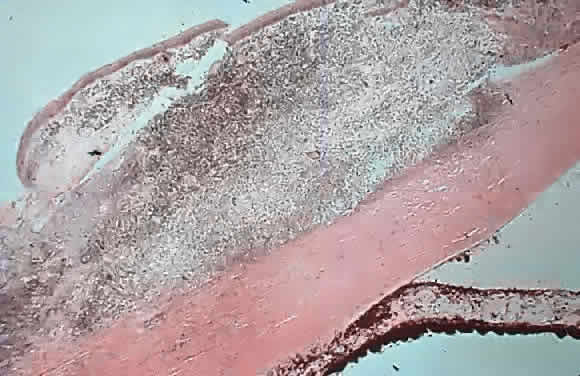 Fig. 1. Histopathologic slide of the iridocorneal angle of a patient with congenital syphilis. Granulomatous inflammation is present on the surface of this eye, and the angle is closed by peripheral anterior synechieae. (Courtesy of Robert Folberg, MD. Copyright University of Iowa. Alward WLM: Color Atlas of Gonioscopy. London, Mosby-Year Book, 1994.)