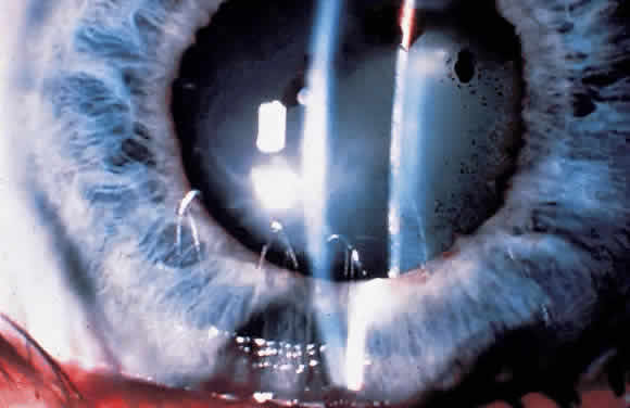 Fig. 6. Keratic precipitates in Fuchs' heterochromic iridocyclitis may be stellate and connected by fine filaments.