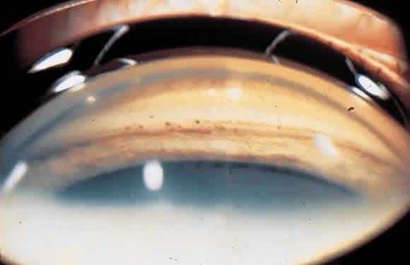 Fig. 4. Gonioscopic view of the iridocorneal angle showing inflammatory precipitates of the trabecular meshwork. (Van Bus-kirk EM: Clinical Atlas of Glaucoma. Philadelphia: WB Saunders, 1986.)