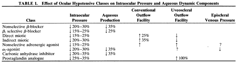 Medical strategies to lower IOP manipulate three components of equation 3: aqueous inflow, conventional outflow, and uveoscleral outflow (Table 1). These three variables (Fin - Fu/C) together can be termed outflow pressure. This is easily estimated as outflow pressure = IOP - Pv. The fourth variable, episcleral venous pressure, cannot usually be altered pharmacologically and presents a theoretic limit for the amount of pressure lowering attainable through medical means. If, for example, Fin were almost completely suppressed, IOP would approach Pv. Of course, certain situations do exist in which IOP falls below Pv; however, these are usually pathologically or surgically induced. Pathologic examples include severe inflammation, phthisis bulbi, choroidal separation, and retinal detachments.