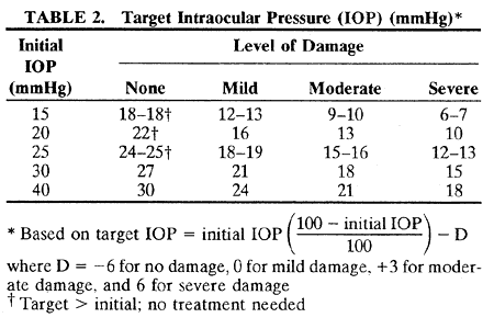 Several different strategies to define target IOPs have been described. One simple goal (simple to define but not necessarily to achieve) is to target all high-tension glaucoma (IOP consistently above 25 mmHg before treatment) to an IOP in the low 20s if the damage is mild, the high teens if the damage is moderate, and the mid-teens or lower if the damage is severe. Another proposed target is a 30% to 50% reduction in the highest untreated pressure at which the patient suffers progressive damage.