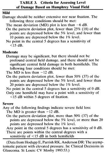 where D is a constant based on the level of glaucomatous damage (perhaps modified by other risk factors). We recommend approximate D values of -6 for no evidence of damage, 0 for mild damage, 3 for moderate damage, and 6 for severe damage. These D values produce a pressure threshold in the high 20s for initiating therapy in an eye without evidence of damage (normal visual field and optic nerve head) (Table 2). In a patient with a reproducible pattern of visual field loss, the level of damage is probably best determined by perimetry (Table 3).52 In patients unable to provide reliable, repeatable quantitative perimetric data, emphasis should be placed on the status of the optic nerve head and nerve fiber layer combined with assessments of confrontation visual field testing and central acuity to determine the level of damage.