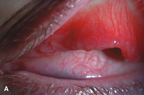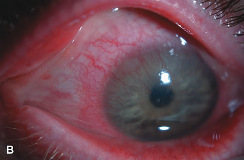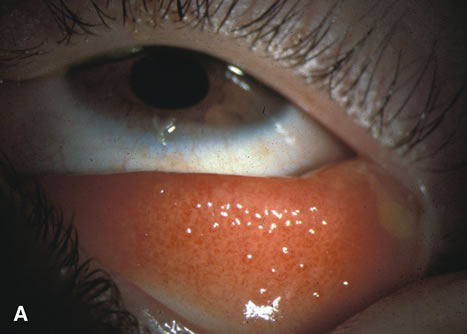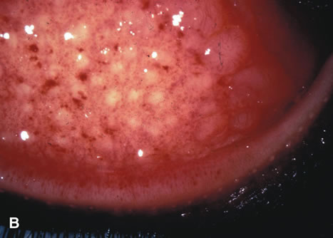 Fig. 9. A. Acute adult inclusion follicular conjunctivitis. Large follicles are evident on the upper tarsus. B. Acute adult inclusion follicular conjunctivitis in a young man initially misdiagnosed, resulting in chronic inflammation and marked superior corneal vascularization.