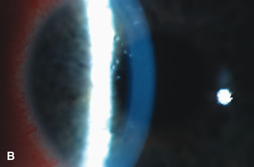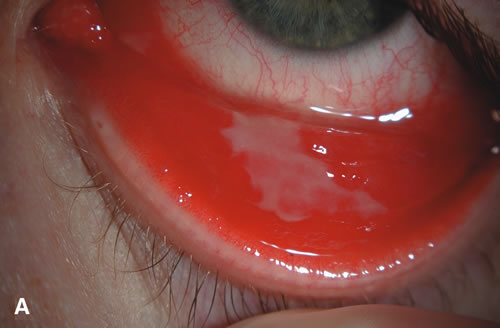 Fig. 8. A. Adenoviral epidemic keratoconjunctivitis demonstrating the presence of a pseudomembrane in the inferior fornix in association with a follicular response. B. Adenoviral epidemic keratoconjunctivitis showing the classical subepithelial corneal infiltrates.