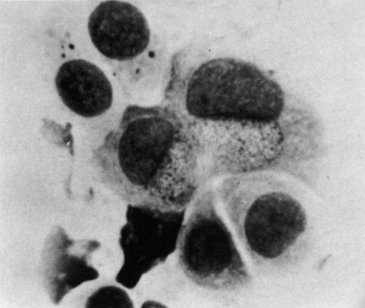 Fig. 10. Intracytoplasmic inclusions in a conjunctival epithelial cell (Giemsa stain). Such inclusions can be found easily in newborns with inclusion conjunctivitis but are less common in older children and adults with inclusion conjunctivitis and trachoma. These inclusions are in cytoplasm and consist of individual elementary bodies (the small infective forms) or larger initial bodies (the intracellular replicative forms).