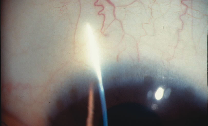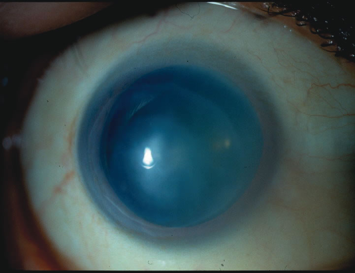 The clinical features of adenoviral keratoconjunctivitis were first described by Fuchs12 in 1889, but it was not until 1955 that adenovirus was identified as the cause of the disease.13 EKC has a wide spectrum of duration and intensity of symptoms. After an incubation period of 2 to 14 days, symptoms begin in one eye; symptoms develop in the second eye 2 to 4 days later. Signs include conjunctival hyperemia and chemosis, intense tearing, and swelling of the conjunctival plica. Ipsilateral preauricular lymphadenopathy is found in many patients. The corneal involvement helps distinguish it from other causes of viral conjunctivitis (Figs. 6 and 7).