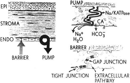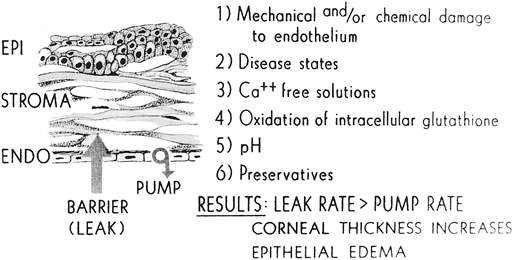 also affect corneal transparency. PHYSICAL FACTORS Epithelium The corneal epithelium is composed of five to seven cell layers with a thickness of approximately 50 μm, accounting for about 10% of the total corneal thickness. The cornea is covered by nonkeratinized, stratified squamous epithelium that is constantly sloughed and regenerated. Limbal stem cells produce epithelial cells that migrate centrally and superficially. The epithelium consists of flat superficial cells, deeper winged cells, and an underlying monolayer of columnar basal cells. The basal cells are responsible for secretion of a basement membrane adjacent to Bowman's layer, which maintains organization of the epithelium and acts as a scaffold on which cells can migrate. One important function of the epithelium is to act as a mechanical barrier to corneal absorption of fluid from tears that may contain instilled topical medications or pathogens residing on the ocular surface. Tight junctions are present in the superficial epithelial cells that help serve a barrier function. Electrical resistance of the cornea predominantly resides in the epithelium, and the resulting impermeability of the epithelium is important in the pharmacokinetics of topical medication penetration.3 The endothelium and stroma have a lower electrical resistance, leading to greater permeability of these layers.4 The transparency of the normal epithelium is the result of the homogeneity of the refractive index of cells throughout this cellular layer.5 When epithelial edema occurs, the epithelium loses its homogeneity and the corneal surface becomes irregular. This surface irregularity causes a reduction in vision along with symptoms of glare, photophobia, and halos around light due to light scatter. The effect of epithelial edema on vision depends on ambient lighting conditions. In mesopic conditions, such as the ophthalmologist's examining room, there may be minimal effect on visual acuity. However, in bright light, edematous epithelium creates light scatter, with marked vision. Surface irregularities caused by epithelial edema are more damaging to vision than stromal edema or scarring. Often the influence of the epithelial surface irregularities on visual acuity is underestimated, whereas the role of stromal scarring and stromal edema is overestimated. Stroma The stroma makes up approximately 90% of the corneal thickness and has a composition of uniformly arranged collagen fibrils in lamellae. The collagen fibrils are surrounded by a ground substance made up primarily of glycosaminoglycans, which include keratan sulfate, dermatan sulfate, and chondroitin. The stroma is for the most part an extracellular compartment with keratocytes and nerves accounting for only 5% and 0.01% of its volume, respectively. Water makes up approximately 70% of the stromal volume. The corneal stroma plays a primary role in maintenance of corneal shape and physical strength. Its constituents help preserve transparency in conjunction with the endothelium. Stromal edema may be caused by malfunction of the endothelium and/or epithelium. When the stroma swells, the diameter of the collagen fibrils remains constant. Swelling is caused by an increase in fluid in the ground substance, leading to an increased anteroposterior spatial separation between the lamellae of collagen fibrils.6 Because the collagen lamellae are oriented in the direction of the corneal diameter, the diameter of the cornea does not increase with corneal edema. Endothelium The endothelium is a monolayer of homogeneous, closely packed, polygonal cells approximately 5 μm thick. The endothelial contribution to maintenance of stromal deturgescence and transparency occurs by two mechanisms. The first mechanism is the barrier function of the endothelium between the cornea and aqueous components, a passive barrier that is much less efficient than the epithelial barrier function. The second mechanism involves the pump function of the endothelium through use of active sodium-potassium adenosine triphosphatase (Na-K ATPase) pumps that actively remove fluid that leaks into the stroma from the aqueous compartment. The normal endothelial cell density is 3000 to 3500 cells/mm2 in the young adult. The number decreases by about two-thirds in elderly patients.7 Even though human corneal endothelial cells have been shown to proliferate in laboratory cell cultures, they have little or no ability for mitosis after birth in vivo.8 When endothelial loss occurs through aging or trauma, the endothelial response is enlargement and sliding of the existing cells to cover the area previously occupied by the lost cells. When cell loss decreases cell density below a critical number (usually 500 cells/mm2, depending on the health of the cells), corneal edema ensues. CORNEAL HYDRATION In addition to physical factors, the transparency of the cornea depends on its hydration status. To maintain transparency, the cornea must remain relatively thin and dehydrated. The corneal stroma of most vertebrates, including humans, swells if placed in aqueous solution because the osmotic load of the glycosaminoglycans in the stroma draws fluid into the stroma. Because the cornea swells only in the direction of its thickness, corneal thickness and hydration are linearly related. This linear relation allows measurement of corneal hydration by measurement of corneal thickness. Preservation of adequate corneal dehydration results from the following five factors: stromal swelling pressure (SP), the barrier function of the epithelium and endothelium, the endothelial pump, evaporation from the corneal surface, and the intraocular pressure (IOP). Understanding the mechanisms of corneal hydration is critical in the management of patients with corneal edema. Stromal Swelling Pressure An excised cornea is normally 78% hydrated, but hydration can increase up to 98% when the cornea is placed in aqueous media, with a proportional increase in its thickness. The stromal sw