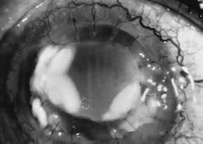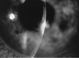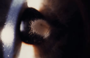 Contact lens wear is an uncommon risk factor in fungal keratitis.24 Filamentous fungi cause most infections associated with cosmetic or aphakic refractive contact lens wear. Candida is the principal cause of keratitis secondary to therapeutic contact lens wear. Pathogenesis of these infections is probably enhanced by fungal contamination of contact lens cases and paraphernalia, by the ability of fungi to adhere to soft contact lenses, and by microtrauma to the corneal epithelium, which accompanies lens wear.