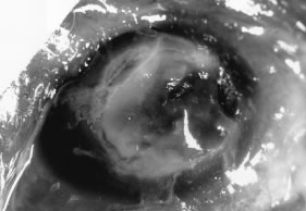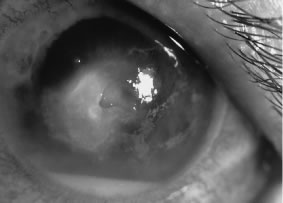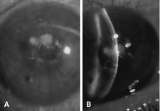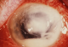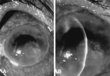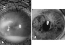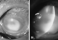 Fig. 26. F. solani keratitis in the right eye of a farmer. A. Dense suppurative necrosis and perforation. B. 9-mm penetrating keratoplasty decentered temporally to surround the area of suppuration and provide an adequate optical zone.