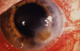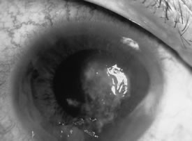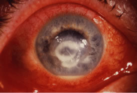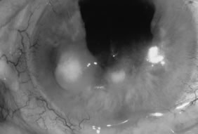 To assess the effectiveness of medical therapy and determine the requirement for surgical intervention, a careful, detailed corneal drawing should be made and the area, depth, and density of the stromal suppuration should be frequently quantitated. The extent of progression of suppuration into the deep stroma is difficult to judge in the presence of an endothelial plaque or fibrinous exudate in the anterior chamber. Abrupt withdrawal of topical corticosteroids produces increased stromal and anterior chamber inflammation, which are difficult to distinguish from signs of progressive invasion of replicating organisms. Imminent perforation is suggested by reduction in the density of the stromal suppuration and improved visualization of the anterior segment secondary to loss of stromal substance.