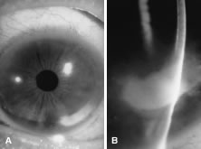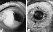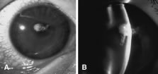 Fig. 27. Fungal keratitis. A. Suppuration and perforation of the peripheral cornea. B. 5-mm penetrating keratoplasty decentered to surround the area of suppuration. Note the graft-host junction within the optical zone. Subsequent 7.5-mm centered penetrating keratoplasty.