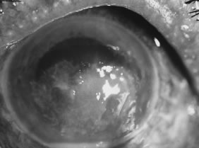 In the early stages of infection, filamentous fungi produce signs that are readily distinguishable from yeast or bacterial keratitis. The most distinctive sign is the presence of delicate, fine, feathery, opalescent, gray-white or yellow-white material in the anterior stroma, surrounded by scant cellular infiltrate or edema (Fig. 1). The epithelium may be intact. The overlying epithelium may be granular and the surface elevated and irregular in contour. Linear infiltrates typically extend into the adjacent stroma. Multiple discrete opacities may develop outside the perimeter of the principal focus of inflammation, either separated by clear stroma or linked by fine linear collections of inflammatory cells and material (Figs. 2 and 3). In the absence of inflammation in the adjacent stroma, branching hyphal fragments may be visualized by biomicroscopy (Figs. 4 and 5). Confocal microscopy may also detect hyphal elements within the stroma.28,29 Peripheral infection resembles noninfectious marginal infiltrative and ulcerative keratitis (Fig. 6). Multifocal keratitis may develop after contact lens wear or injury by multiple projectiles (Fig. 7). In the early stages, iritis is present and the intraocular pressure remains normal. Inappropriate, empirical therapy of fungal keratitis with topical fluoroquinolone or aminoglycoside antibiotics may suppress or eliminate the superficial elements but allow extension of the organisms into the stroma because these agents may possess selective antifungal activity.4,30,31