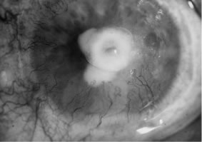 If corneal suppuration progresses despite maximum antifungal therapy, consideration must be given to surgical intervention by penetrating keratoplasty. Progression is characterized by increased area of stromal suppuration, advancement of suppuration into the deep stroma, stromal ulceration to the point of extreme corneal thinning, dense fibrinous exudate in the anterior chamber, increased intraocular pressure, and corneal perforation. Failure of medical therapy and progressive stromal necrosis occur most commonly in advanced, untreated fungal keratitis, particularly if enhanced by corticosteroid therapy; in F. solani and Scedosporium keratitis; in infection following traumatic inoculation of organisms into the deep corneal stroma; and in C. albicans infections in eyes with severe predisposing factors, such as atopic keratoconjunctivitis or cicatricial pemphigoid. Among 435 consecutive cases of microbial keratitis at the Bascom Palmer Eye Institute between 1983 and 1986, therapeutic penetrating keratoplasty was required seven times more frequently in fungal keratitis (14 of 59) than bacterial keratitis (13 of 376).69