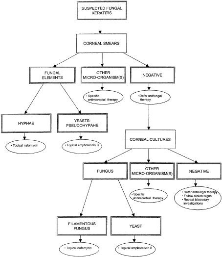 Fungal keratitis is caused by invasion of the cornea by filamentous fungi, yeasts, and dimorphic fungi. The steps in management of fungal keratitis are identical to other forms of infectious microbial keratitis: Make the clinical diagnosis, perform proper laboratory studies, initiate antimicrobial therapy, modify therapy, and terminate therapy. The purpose of this chapter is to provide guidelines for prompt recognition, laboratory diagnosis, and treatment of fungal keratitis.