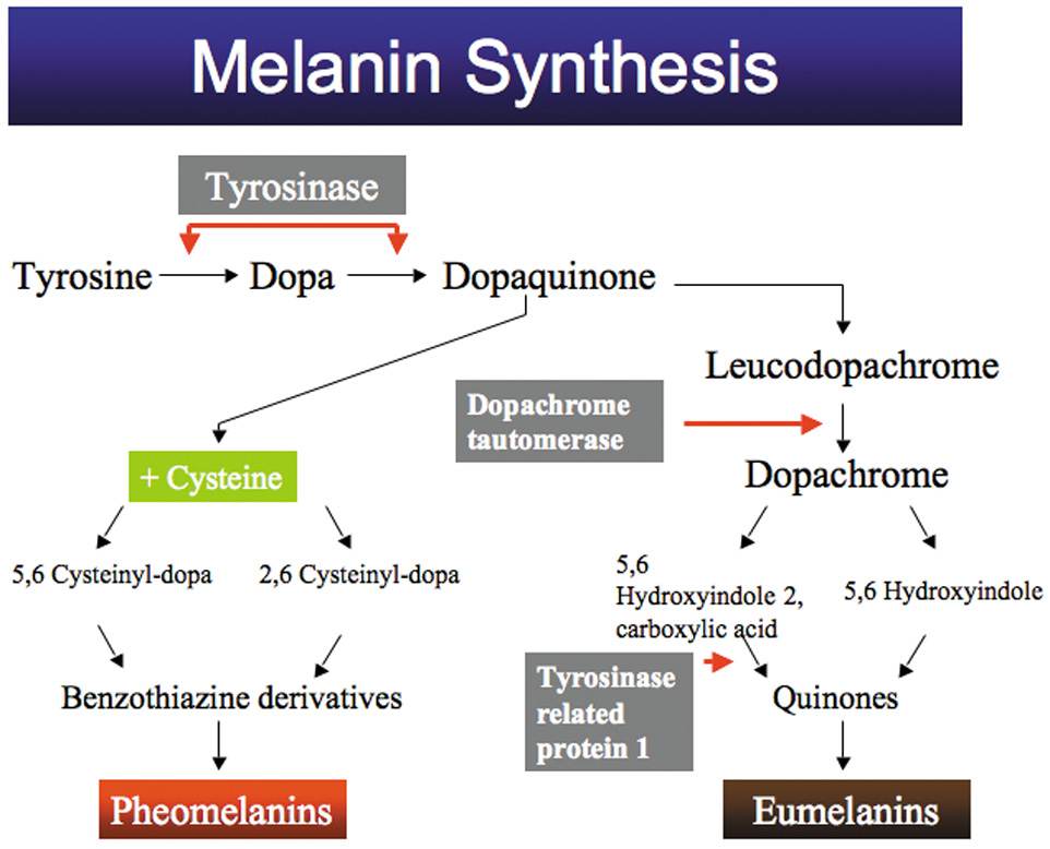Melanin synthesis (Fig. 1) starts with the amino acid tyrosine, which is oxidized to dihydroxyphenylalanine (DOPA) by the enzyme tyrosinase. DOPA is then oxidized to dopaquinone by the same enzyme. Dopaquinone is spontaneously transformed to leucodopachrome, and then to dopachrome. The latter is decarboxylated to 5,6-dihydroxyindole, and then oxidized to indole 5,6-quinone. Indole-quinone is converted to melachrome, and then polymerizes to eumelanin (pigment with brown to black color). Dopaquinone can react with cysteine under high concentrations of the latter to form cysteinyl-dopa, which is oxidized to pheomelanin (a pigment with a yellow to red color). DOPA can also react with glutathione to form pheomelanin.