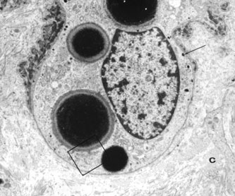 Fig. 2. Electron micrograph of an epidermal melanocyte in Nettleship-Falls X-linked OA. Four macromelanosomes and some normal-sized melanosomes (arrow) are shown (original magnification, 8,000×). (Reprinted from Ref. 54.)