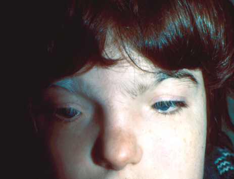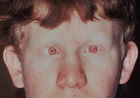 Fig. 3. Teenager with tyrosinase-positive OCA. Note the iris transillumination, esotropia, and reddish-brown hair color.
