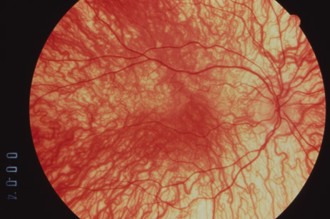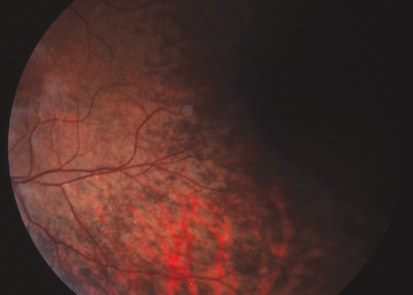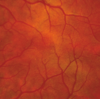 Fig. 5. Prominent choroidal vascular pattern in a patient with OCA. Note the absence of RPE and choroidal pigmentation.