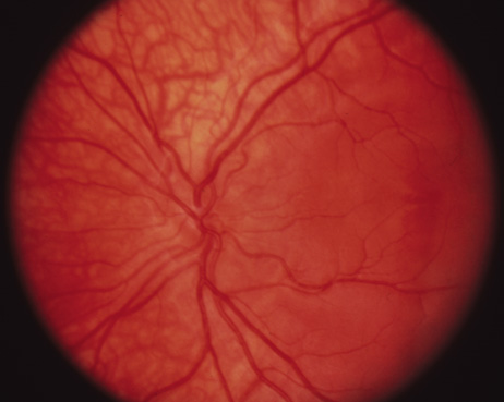 The ocular manifestations of patients with albinism vary in severity among the different types of this heterogeneous group of conditions but share characteristic common features.31 Sensory nystagmus is present very early in life but improves in amplitude and frequency with increasing age. This is frequently the presenting sign of the disorder. In most cases the nystagmus is pendular and horizontal. Occasionally a null region and compensatory face turn may be present. A detailed discussion of eye-movement abnormalities in patients with albinism is beyond the scope of this review. Reduced visual acuity is present from birth, and ranges from 20/40 to 20/400 in most cases. Vision usually remains stable, but may improve slightly with age in some patients. Poor binocular vision and reduced stereopsis may be present; however, many patients can pass parts of the clinical stereo tests.32 Iris color ranges from light blue with a pink reflex in OCA1A to hazel in other types, and may change as more pigment is deposited with age. Iris transillumination is best detected by means of the slit-lamp and retroillumination in undilated patients. In some cases the outline of the lens can be seen through the iris (Fig. 4). Hypopigmentation of the iris pigment epithelium results in light scatter and contributes to the subjective complaint of photophobia in some (but certainly not all) patients. Fundus hypopigmentation is also variable. A dilated-fundus examination may reveal a prominent choroidal vascular pattern resulting from decreased or absent RPE melanin (Fig. 5). The optic nerve head may be grayish in patients with OCA1A, or it may be hypoplastic (Fig. 6). Absent macular xanthophyll pigment and a diminished foveal reflex indicate foveal hypoplasia (Fig. 7).33,34 The latter is considered one of the main factors underlying reduced visual acuity in albinism. Abnormal macular vascular patterns may be present in which retinal vessels course through the foveal avascular zone instead of arching around it, which is a hallmark of foveal hypoplasia.35 Whether foveal hypoplasia in albinos is directly related to reduced macular RPE melanin is unknown. Optic nerve hypoplasia is a well documented but not very common finding in albinos.36 Megalocornea, aniridia, posterior embryotoxon, Axenfeld's anomaly, glaucoma,37,38 retinal coloboma, and abortive cryptophthalmos have also been reported in rare individual patients, and except for mild anterior segment dysgenesis are probably coincidental.