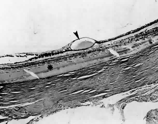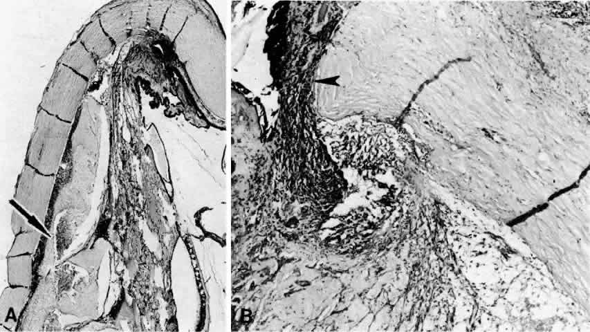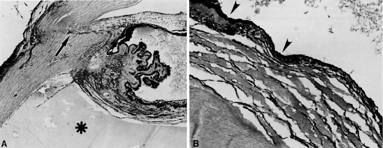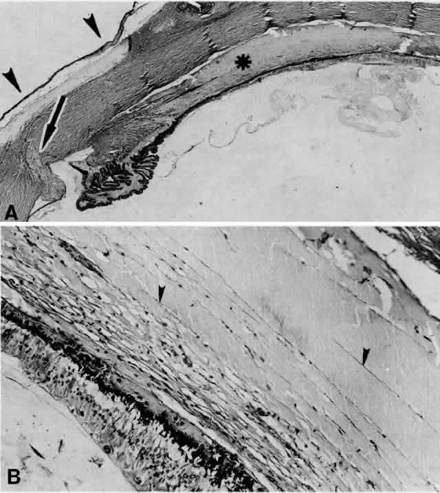 the vortex veins,4 the sclera itself,5 or through perivascular and perineural spaces in scleral emissary channels.6 Anteriorly, the connective tissue fibers that attach the ciliary body and anterior choroid to the sclera are long and oriented tangentially. A tangential arrangement permits movement of the choroid during accommodation7; however, it also readily allows for the accumulation of fluid. The anatomic arrangement of the fibers anteriorly is analogous to the tangential fibers in the outer plexiform layer in the macula, another location where fluid selectively accumulates. Posteriorly, the choroid is more firmly connected to the sclera by fibers that are short and oriented perpendicularly between the choroid and sclera.8 The choroid is also firmly anchored to the sclera at the optic disc, at the ampullae of the four vortex veins, and by the ciliary body at the scleral spur. The attachments at the disc and four ampullae account for the characteristic four-lobed structure of a large ciliochoroidal effusion. The term detachment is often used clinically to describe a ciliochoroidal effusion. Indeed, in some cases there is an actual cleavage of the fibers that connect the ciliary body and choroid to the sclera. Moses8 showed that a force of about 5 g/cm is required to break these connecting fibers. In such cases, the fluid is located between the ciliary body and choroid and the sclera and is properly referred to as a detachment. |