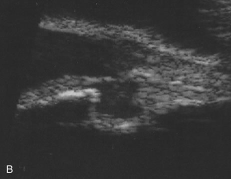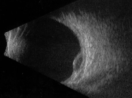 Pseudomelanoma Melanomas can masquerade as uveitis, and some inflammations or hemorrhagic processes can simulate melanoma. These processes include posterior scleritis, focal choroidal hemorrhage or detachments, and focal scleral thinning. Figures 9 and 10 demonstrate focal scleral thinning in the area of the superior rectus insertion in a patient with rheumatoid scleritis that produced a pseudomelanoma. An apparent elevated pigmented mass was noted on upgaze, but no tumor was observed when the eye was in primary position. Posterior scleritis is often not painful, although some of these patients have deep, piercing pain and increased discomfort during eye movement. Ultrasound usually is diagnostic, demonstrating fluid inside of Tenon's capsule (Fig. 11). A focal hemorrhagic choroidal detachment after cataract surgery can simulate a melanoma. These lesions usually have a bright area of hemorrhage at their base, whereas melanomas typically do not have associated hemorrhage until they break through Bruch's membrane (most commonly, such tumors are more than 5 mm thick). The differential diagnosis of uveal melanoma is discussed elsewhere in these volumes.