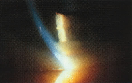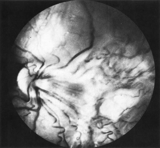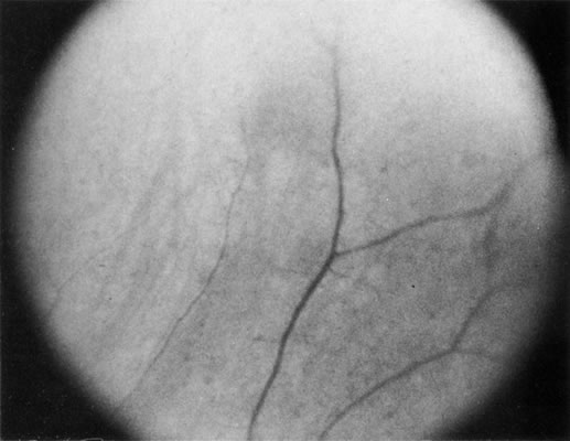 The role of MRI in the evaluation of intraocular masquerade syndromes is unclear. There was initial enthusiasm about the possibility of differentiating atypical uveal melanomas from hemorrhagic-simulating lesions based on the unique paramagnetic properties of melanin.13 In relation to vitreous, a uveal melanoma typically has a bright signal on a T1 image and a dark signal on a T2 image. In contrast, hemorrhagic processes tend to be either bright or dark on a T1 image and bright on a T2 image.14 Unfortunately, there are several problems with MRI for uveal melanoma diagnosis. First, several investigators have shown that unless high field-strength, thin-section scans with surface coils are used, the quality of data obtained is suboptimal.15 Second, even in a state-of-the-art center, we have had a number of cases in which we were unable to differentiate between a uveal melanoma and a simulating lesion on the basis of MRI data. We obtain MRI studies in older patients with opaque media, equivocal ultrasonographic data, and large masses. In some of these cases, the MRI is diagnostic of either a melanoma or an extramacular disciform (hemorrhagic) process. It is also a useful adjunctive study if localized extraocular extension is suspected. In equivocal cases, however, we proceed to using invasive diagnostic techniques, such as fine-needle aspiration biopsy (FNAB) (see Metastatic Tumors). In addition to producing media opacity, inflammation, and cataract, uveal melanomas can also produce other signs that may lead to the incorrect diagnosis of uveitis. Anterior melanomas, especially those that involve the ciliary body, often produce dilated episcleral vessels (sentinel vessels) that occasionally have been misdiagnosed as scleritis (Fig. 6).