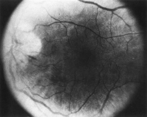 A number of retinal lesions can either produce or simulate uveitis. Retinal detachments can occasionally produce enough inflammation for anterior uveitis to obscure both fundus detail and the correct diagnosis. In a patient with markedly decreased vision and media opacification, an ultrasonographic evaluation is mandatory to rule out a neoplastic or foreign body process. Cases of inapparent retinal detachment also can be correctly diagnosed with ultrasonography. Uncommonly in central serous choroidopathy, protein deposition at the leakage point can simulate a focal choroiditis. Medullated nerve fibers can simulate retinochoroiditis, but the shape, corresponding to the nerve fiber layer with the absence of other signs of inflammation, usually allows a clear-cut differentiation.53 Some retinal dystrophies and degenerative processes can simulate a retinochoroiditis. Vitreous cells may occur in cases of retinitis pigmentosa. Pigmented paravenous retinochoroidal atrophy has a distinctive pattern of pigmentary deposits surrounding retinal veins; it may occur as an idiopathic degenerative disorder or sometimes as a sequela of ocular sarcoid. Fundus flavimaculatus is a rare autosomal recessive dystrophy that is usually detected in the third decade of life. It produces typical comma-shaped, yellowish retinal pigment epithelial opacities in the posterior pole, but it does not involve the macula. It can simulate a diffuse choroiditis (Fig. 24). Myopic degeneration can produce small, white, posterior pole spots that can simulate a posterior choroiditis. Peripheral fundus “paving stone” degeneration is rarely confused with an inflammatory process. These lesions show no evidence of retinal or vitreal inflammation and are quite common.54