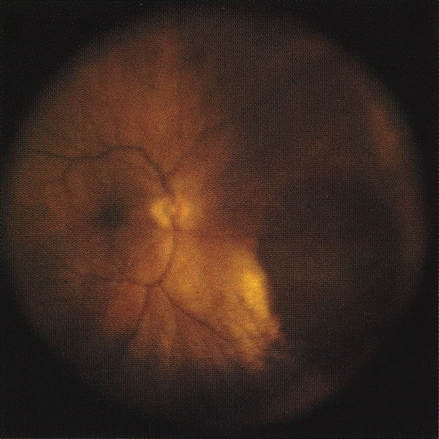 Juvenile xanthogranuloma, a benign lesion, usually presents in children less than 1 year of age; it is characterized by a spontaneous hemorrhage and a poorly demarcated yellowish iris tumor.61–64 Only about-one third of children have the complete form of this disease.64 Combined retinal and retinal pigment epithelial hamartomas can also produce a pattern that simulates retinitis (Fig. 29). The pigment at the level of the retinal pigment epithelium, the surface fibrosis, and the vascular changes are typical features of this entity.