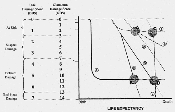 EARLY VERSUS LATE CHANGES. In the later stages of the disease, one can be fairly sure about whether the optic nerve is glaucomatous or not. By later stages of the disease is meant a situation in which there is absence of rim tissue in one area of the optic nerve, especially supertemporally or inferotemporally. However, in the early stages of glaucoma it is not possible on the basis of a single examination to determine whether the optic nerve is damaged. For example, a patient with a central cup and a rim/disc ratio of approximately 0.3 in all areas could have an optic nerve that has improved, remained the same, or gotten worse (Fig. 2). Consequently, in the early stages of the disease it is impossible to determine whether an optic nerve head is healthy or diseased on the basis of a single ophthalmoscopic or image analysis examination. On the other hand, it is possible with a high degree of reliability to look at such an optic nerve and determine whether or not a visual field defect is present. Normal-sized discs (around 1.75 mm) with rims thicker than 0.1 rim/disc ratios rarely have visual field loss. Small discs, that is, discs that are smaller than 1.5 mm in diameter, will rarely have visual field defects when the rim/disc ratio is greater than 0.2. Obviously, if no visual field defect is present, it is unlikely that the patient will have any disability as a result of any change that has already occurred in the optic nerve. Thus, even though it is not possible to look at an optic nerve without an acquired pit of the optic nerve, a notch, or complete loss of the neuroretinal rim all the way to the outer edge of the rim and determine with certainty whether or not the disc is damaged, it is possible to determine whether such a disc will be associated with any functional loss of vision. DISC CHANGES USUALLY PRECEDE FIELD CHANGES. The next critical piece of information in deciding on whether treatment is necessary is to recall that the early visual field defects that occur in glaucoma are asymptomatic. Patients can develop an extensive loss of nasal field in one eye and yet be able to function entirely normally. That fact is often mentioned as one of the characteristics that makes glaucoma especially dangerous. Indeed, the lack of symptomatology in the early stages of chronic glaucomas is the reason why patients often have advanced damage when first seen. However, the lack of symptomatology in early glaucoma also means that it is not essential to prevent a patient with early glaucoma from developing further, early disc damage or even from developing visual field loss. One should remember that the goal of therapy is the health of the patient, that all treatments have some side effect, and that slight deteriorations of the optic nerve and visual field in the early stages of glaucoma do not cause any symptomatology. Thus, it becomes difficult to justify surgery in the early stages of glaucoma until enough deterioration has occurred so that loss of visual function as a result of glaucoma is relatively certain if the deterioration continues. It is helpful to plot the patient's changes in the stages of glaucoma on a graph (Fig. 3). For rational treatment of glaucoma, the patient's life expectancy must be considered. Surgery is not justified on a patient with early, or even moderately advanced glaucoma who is getting worse slowly, whose life expectancy is 6 to 12 months. However, there is little justification for not doing a glaucoma procedure on a patient with the same amount of damage, getting worse at the same rate, who has a life expectancy of 40 years. Although it is not possible to determine life expectancy with complete precision, it is possible to get a good idea. Factors that enter into that determination are shown in Table 10.
