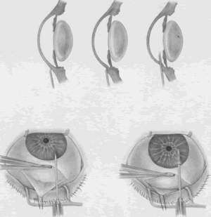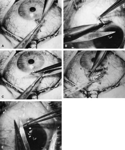 the cornea is covered. The surgical anatomy of the anterior chamber angle in an average eye is shown in Figure 4A and B. Landmarks will differ markedly in eyes that have abnormalities. In the myope, the space between the anterior limbus and the iris root is greater; in the hyperope, it is less. An incision at the corneoscleral sulcus may enter the anterior chamber far anterior to the trabecular meshwork in the myope but may enter the posterior chamber in the hyperope. Because glaucoma in infants is rare, its surgical treatment is not discussed in detail. However, guarded filtration procedure is described later and may be employed with satisfactory results in many patients with congenital glaucoma (trabeculodyspenesis). PREOPERATIVE CARE The reader should refer to the earlier section of this chapter on evaluation of the person. The goal is to move the patient from conditions auguring failure toward those promising success. Obviously, many factors cannot be changed. In the simplest terms, the healthier the eye and the less likely it is that scarring will develop when the eye is injured, the greater the chance for success. Preoperative care is discussed in greater detail in the sections that describe the operative procedures. Many people take aspirin products routinely. Aspirin comes in many forms, and it is part of many compounds. Because it predisposes patients to bleeding, it should be discontinued, if prudent, 2 weeks before surgery. Most people who are taking aspirin are taking it for relatively unimportant indications; some simply may have heard that aspirin can help prevent heart attacks. However, in some patients, aspirin may be an important part of treatment, and discontinuation of the aspirin must be coordinated with the physician who ordered the aspirin. Wherever feasible, it should be discontinued preoperatively. Other agents also predispose patients to bleeding, for example, dipyridamole and anticoagulants, such as dicumarol. These agents should be discontinued an appropriate time before surgery to allow the blood to return to a normal clotting state. Some patients may have to take heparin instead of dicumarol at the time of surgery. This substitution must be individualized and coordinated with the physician managing the patient's anticoagulants. PARACENTESIS A paracentesis should be part of virtually all intraocular glaucoma surgical procedures. This opening in the cornea facilitates management of complications such as bleeding or flat anterior chamber; allows deepening of the anterior chamber at the time of surgery; provides an entry for acetylcholine or sodium hyaluronate; allows the surgeon to determine at the time of surgery how much filtration, if any is occurring through the guarded filtration procedure or sclerostomy; permits safe development of a bleb at the conclusion of surgery; and allows the surgeon to detect whether any tears or leaks are present in the conjunctival flap. The major risk of the procedure is that it may damage the lens. This damage can be avoided by making sure that the instrument used to develop the paracentesis never points toward the lens; holding the instrument parallel to the iris surface eliminates the risk of damaging the lens. Fixation of the globe is critical. The point of fixation should be directly in line with the intended direction of the paracentesis. If the paracentesis is to be made at the 10 o'clock position, extending exactly inferiorly, the sclera should be held directly superior to the 10 o'clock position (Fig. 5). If the surgeon prefers a horizontal paracentesis, starting at the 3 o'clock position, then the globe must be fixated precisely at the 3 o'clock position. An instrument with fine teeth provides good fixation. Examples are the Bonn or Barraquer-Colibri fine-toothed forceps. The tips should be separated only slightly, approximately 1 mm, and then pressed hard against the sclera. Conjunctiva, Tenon's capsule, and episclera are not adequate sites for fixation. We prefer to use a new, sharp, short, disposable 27-gauge needle on a 2- or 5-ml syringe. The needle is held, bevel up, absolutely parallel to the iris surface. In an eye with an iris bombe or a flat anterior chamber, the needle actually may be pointing anteriorly. The tip of the needle is placed against the cornea in the desired position, and the globe is pulled by the fixating hand in the direction opposite to that in which the needle is pointing. For example, if the needle is held horizontally, at the 3 o'clock position of the left eye, then the sclera is grasped at the 3 o'clock position and pulled laterally (temporally) (see Fig. 5). The needle tip enters the cornea. If there is normal or elevated pressure and the chamber is deep, the needle penetrates the cornea after making a paracentesis that is approximately 1 to 2 mm long. If the eye is soft or the chamber is shallow, the needle remains in the cornea and does not penetrate the anterior chamber. This position is desirable in cases in which the cornea is thin, such as in the buphthalmic eye. If the intracorneal track is longer than 2 mm, then the needle and syringe are depressed back toward the apex of the orbit; they are depressed toward the floor of the operating room (see Fig. 5, top right). The tip of the needle must not be angled toward the iris-lens; it must be kept parallel to the iris. As the needle and syringe are pushed toward the floor, the needle changes the curvature of the cornea, permitting it to enter the anterior chamber when advanced. The needle is advanced by a combination of pulling the globe and pushing the syringe. The importance of firm fixation and of introducing the needle against traction provided by the fixation must be stressed. Also, it is essential that the needle not be angled toward the iris, but kept parallel to the iris surface. Once the needle enters the anterior chamber, it is more clearly visible than when it is intracorneal (see Fig. 5, bottom right). The tip is advanced c