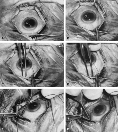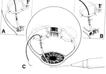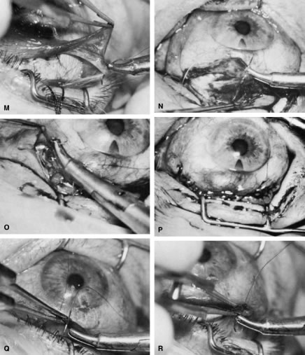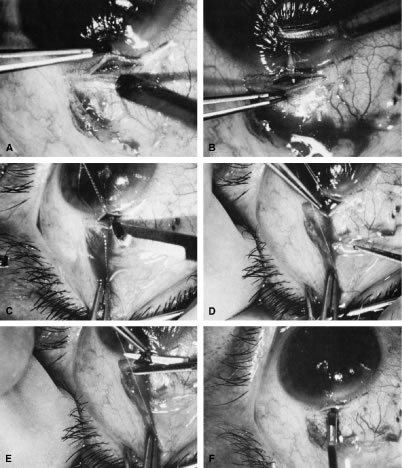 Once the anterior chamber is maintaining a well-formed condition, long-acting cycloplegic agents, such as atropine, can be discontinued. As soon as the intraocular inflammation begins to resolve, the topical steroids can be tapered, and, in most cases, they should be discontinued within 3 weeks of surgery. Longer usage predisposes patients to cataract and steroid-induced glaucoma. Systemic steroids are used by some surgeons, and they may increase the success rate arid tend to produce an eye with a thin, polycystic bleb and a low final IOP. The complications of systemic steroids, however, are significant, and must be taken into account. One of the most helpful maneuvers after a guarded filtration procedure is the CTM,58 which is shown in Figure 16. This technique of applying pressure in a localized fashion directly over the radial edge of the scleral flap is appropriate for guarded filtration procedures that are performed so that the scleral flap overlies a small edge of underlying cornea and sclera. Localized pressure at the radial edge of the flap deforms the edge, disrupting the union between the overlying scleral flap and the underlying corneosclera. Thus, gentle pressure will encourage aqueous to flow through the radial edge of the scleral flap unlike the technique that has been used for generations to encourage aqueous to flow out of a sclerostomy.54 This technique involves pressing oh the globe, which increases the IOP and causes the underlying sclera and cornea to be pushed up against the overlying scleral flap, making the apposition between these two tissues even tighter. Thus, this technique does not work well in patients who have had a guarded filtration procedure and may be more likely to force iris into the internal ostomy opening. The CTM is performed by anesthetizing the eye well with several instillations of proparacaine 0.5%.58 A sterile, cotton-tipped applicator is soaked with the anesthetic agent. With the patient observed at the slit lamp, the upper lid is lifted, the patient is asked to look down, and gentle pressure is applied with the tip of the applicator directly over one of the radial grooves of the scleral flap. This maneuver should be associated with immediate shallowing of the anterior chamber, development of a high bleb, and fall of IOP. If these changes do not occur immediately, the applicator is placed over the other radial incision, and pressure applied. It may be necessary to try several locations until the spot is found where pressure will cause deformation of the incision arid result in encouraging filtration. The CTM should be done gently. In our hands, it has not been associated with complications. It may be repeated three or four times daily for the first 3 or 4 days to encourage the development of a patent fistula. After 2 weeks or so, it probably will not have a permanent effect on the outcome of surgery. We often use the CTM in the early postoperative period. However, we do not believe in long-term continued use of massage or pressure of any kind. In our opinion, this pressure is traumatizing to the eye and rarely results in an improvement in the long-term result. When CTM does not re-establish satisfactory filtration or when the IOP remains higher than the surgeon has hoped and filtration is inadequate, it often is helpful to release one of the 10-0 nylon sutures in the scleral flap by burning the suture transconjunctivally with an argon laser. A small lens is used to flatten the conjunctiva. We use the lens designed by Hoskins.54 The edge of the Zeiss four-mirror lens also may be used. The Hoskins lens compresses the conjunctiva, making a suture in the sclera easily visible. The suture can be burned with a spot size of 50 μm, an exposure time of 0.1 second, and a power of 300 to 700 mW, using the blue or green light of the argon laser. Depending on the laser and the surgeon's technique, more or less power may be necessary. In most cases, one or two applications with a laser will burn through the suture, allowing it to retract and releasing traction on the incision. In many instances, a bleb develops immediately, and IOP falls. Several sutures may need to be released to obtain adequate filtration. As mentioned earlier, when the surgeon plans to release sutures with a laser, a 10-0 nylon suture can be placed in the middle of the posterior edge of the flap so that there is no excessive filtration when sutures are released. In the presence of subconjunctival blood, there is a significant risk of conjunctival burns or holes. Use of the red krypton laser reduces absorption by blood and increases the success of suture lysis in the presence of subconjunctival blood. The management of complications is covered in the third section of this chapter. TRABECULOTOMY Trabeculotomy is useful for managing congenital glaucoma where Schlemm's canal can be identified. Although goniotomy is the procedure of choice in infants or children with congenital glaucoma in whom the cornea is sufficiently clear to allow the surgeon to see into the anterior chamber angle, trabeculotomy is a satisfactory second choice, and it is the preferred procedure where the cornea is hazy. It is of value in the secondary glaucomas as well, especially the open-angle inflammatory glaucomas, such as those seen in association with Still's disease. The procedure demands high magnification; it is best done with an operating microscope. The initial portion of the operation is virtually identical to a guarded filtration procedure (Fig. 17; see also Fig. 15). A fornix-based or limbus-based conjunctival flap is developed at the 12 o'clock position. A scleral flap approximately 4 × 4 mm is fashioned, hinged at the limbus (see Fig. 13A). This flap, however, differs from a guarded filtration procedure flap in that it should be thicker; whereas a trabeculotomy flap ordinarily is one third to one fourth the thickness of the sclera, when performing a trabeculotomy, the scleral flap should be two thirds t