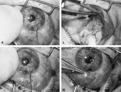 After the iridectomy is complete, the iris usually will return spontaneously into the anterior chamber unless it has suffered damage as a result of high pressure (as occurs in severe attacks of angle closure glaucoma). In patients with a reactive sphincter, it usually is necessary only to release the iris from the grasp of the incision. The iris can be stroked into position with the use of a blunt instrument on the corneal surface. Attempting to reposit the iris by directing a stream of irrigating solution into the incision is not recommended; the solution may enter the posterior chamber, forcing even more iris out of the incision. If the surgeon has difficulty restoring the iris to its proper position, injection through the previously placed paracentesis track of freshly mixed acetylcholine usually will solve the problem. In the eye with a dilated fixed pupil and a flaccid iris, it often is preferable to perform a sector iridectomy. Once the pupil is entirely round, the suture placed previously in the corneoscleral incision can be pulled up and secured promptly. Injecting balanced salt or acetylcholine solution through the previously placed paracentesis can deepen the chamber. In patients who have had recent angle-closure attacks and in whom peripheral anterior synechiae may be newly developed, forceful deepening of the anterior chamber at this point may tear open the synechiae and restore normal function of the anterior chamber. The procedure of chamber deepening must be done cautiously, with careful monitoring of IOP. A gonioprism, such as the Zeiss four-mirror lens, can be used with an operating microscope to monitor the effect on anterior chamber angle. At the close of the procedure, the pupil should be round, the chamber deep, and the incision sufficiently closed that there is no leakage. The IOP should be approximately 15 to 30 mm Hg, being raised to that level by injection through the keratostomy. Such a pressure may help prevent subsequent choroidal detachment and allows the integrity of the incision to be tested. If the corneoscleral incision has been properly placed and sutured, there should be minimal transient astigmatism. Vision should return to the preoperative level within several days. If the eye is inflamed, it usually is helpful to instill a short-acting cycloplegic agent such as cyclopentolate. Furthermore, the surgeon may give a subconjunctival injection of corticosteroid, although it rarely is necessary to do so. An antibiotic ointment and a light patch usually are applied until the facial nerve block has worn off. If there is a reasonable chance that the patient will need a filtration procedure at a later date, then the surgical procedure is modified to perform the iridectomy through clear cornea, rather than under a fornix-based flap. The technique is almost exactly the same, with the obvious exception that the incision is placed through clear cornea. Postoperative Care In almost all instances, iridectomy can be performed as an outpatient procedure. However, when associated with severe pain or when the attack of angle closure has been difficult to stop and has required extensive usage of carbonic anhydrase inhibitors and osmotic agents, admission of the patient to the hospital may be justified. Especially in older and infirm patients, the general state of health must be monitored carefully. It is important to verify that the patient has not become overly dehydrated or experienced an attack of congestive failure. The eye patch usually is removed from the treated eye as soon as the facial nerve block has worn off. If the procedure is done on an outpatient basis, a patch and shield may be left in place until the patient returns the next day for the first postoperative visit. A drop containing a corticosteroid can be used topically three or four times a day until the inflammatory response has disappeared, usually 4 to 7 days. Careful attention must be paid to the state of the pupil. The development of posterior synechiae is an important and usually unnecessary complication. Although it is not clear that posterior synechiae predispose the patient to the development of cataract, the presence of such adhesions makes extracapsular cataract extraction more difficult. Because many patients with angle-closure glaucoma will later have cataract extraction, the development of such adhesions may jeopardize the long-term visual result. Furthermore, inability of the pupil to dilate in the dark may limit the patient's visual function, especially in conjunction with a developing cataract. In most cases, dilating drops are used routinely until the inflammatory response has worn off. One acceptable program is to use tropicamide 1% at sufficient intervals to ensure that the pupil is dilated adequately for a period of approximately 1 week. The medication can be continued at bedtime for 2 to 3 weeks, or even longer, until it is certain that the inflammatory response has disappeared. Many patients are given pilocarpine preoperatively. There is a tendency to continue the administration of pilocarpine postoperatively, especially when control of IOP has been difficult. This practice should be discouraged. Pilocarpine will predispose patients to posterior synechiae and should be avoided if possible. The drug of choice for pressure control usually is topical epinephrine, a β-blocker, or epinephrine plus a β-blocker. If these two agents are not adequate, a carbonic anhydrase inhibitor can be used until the eye is entirely quiet, at which time pilocarpine can be reinstituted. In such cases, however, care should be taken to dilate the pupil periodically to prevent the development of posterior synechiae. Some surgeons may be reluctant to use dilating drops for fear of inducing angle closure. This possibility exists, but it is uncommon. Furthermore, it is preferable to know immediately whether the iridectomy has eliminated the possibility of angle closure caused by papillary dilatation. Therefore