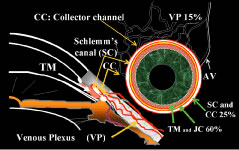 Both nonpenetrating procedures are designed to decrease outflow resistance not eliminate it, as may uncontrollably occur with standard filtration surgery. In generic terms, NPFS consists of fashioning dual scleral flaps (Fig. 20) with removal of the deep flap (deep sclerectomy) leaving an internal limiting membrane and an intrascleral aqueous reservoir. More specifically, the intrascleral space and ostia of Schlemm's canal are filled with viscoelastic in viscocanalostomy or a collagen wick placed in the intrascleral space as in DSCI.104 Prospective studies comparing DSVC to standard filtration surgery reveal greater pressure reduction with trabeculectomy.105 Thus, patients with severe glaucomatous damage, especially exposed to long-term topical therapy, are more likely to benefit from standard filtration techniques. Another study comparing deep sclerectomy with and without collagen implant to trabeculectomy found comparable results between the procedures.106 How does NPFS fit into our incisional options? At this time, it is difficult to sort out the best candidates for NPFS. Each new case adds a piece to the puzzle of how these procedures truly work and who will most likely benefit. Results from a black African population are encouraging107 but have not been reproduced in other patient populations. Can we directly extrapolate the same technique to different populations with dissimilar types of glaucoma, years of topical therapy, and variable outflow pathology? A recent study reveals NPFS in patients with primary open-angle glaucoma was more effective in patients without prior medical therapy than in patients on years of topical medical therapy.108 Glaucoma medications may cause changes in the conjunctiva and episcleral that lead to failure in any type of filtration procedure,109 possibly more detrimental for nonpenetrating procedures. The learning curve for NPFS procedures is very steep, much like trabeculotomy in an infant eye. A review of outflow anatomy is crucial before nonpenetrating procedures (Fig. 21). DSCI and DSVC are headed down two competing pathways, one with internal filtration and the other with external filtration. External filtration as seen in DSCI still produces a bleb. Bleb formation with viscocanalostomy is minimal although microcysts may form above the 300-micron scleral flap. The proposed mechanisms of IOP reduction for NPFS are seen in Figure 22. Direct intraoperative evidence for enhancement of outflow facility can be seen during DSVC. Observation of this phenomenon has caused a renaissance in outflow surgery (Fig. 23). Patient selection for NPFS is more complicated than for standard trabeculectomy. Patients with significant complications from prior trabeculectomy or at high risk for failure may be candidates for NPFS. The problems with nonpenetrating procedures are unique and require a completely different set of preoperative, intraoperative, and postoperative thought processes and skills compared with trabeculectomy or trabeculotomy. Preoperative Considerations