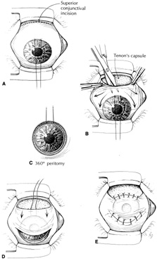 Fig. 1. A. Limbal traction suture, superior incision site. B. Dissection of conjunctiva from Tenon's capsule. C. Complete conjunctival peritomy. D. Flap should be free of traction. E. The flap is sutured into place above and below.