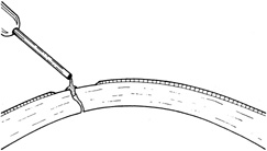 Initially, the limbus should be reapproximated with 8-0 or 9-0 nonabsorbable nylon or silk sutures to restore normal anatomic relationships. Any prolapsed or incarcerated iris should be repositioned, after which the corneal portion of the laceration is repaired as described earlier. The scleral laceration is then explored to ascertain the extent of damage. For smaller lacerations, a localized conjunctival peritomy is made to explore the wound. A 360-degree peritomy is made for larger lacerations to explore all quadrants. During exploration, care is always taken to avoid iatrogenic avulsion of intraocular contents. The use of loupes rather than the surgical microscope may facilitate the broader three-dimensional view required for repair of scleral laceration.