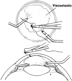 A viscoelastic agent is useful for maintaining the anterior chamber and protecting the intraocular structures during manipulation of an intraocular foreign body. A viscoelastic agent may also be used to hydraulically move a foreign body across the anterior chamber. Intracameral miotic agents (acetylcholine or carbachol) may also be used to constrict the pupil and protect the lens. In cases in which the lens is disrupted, the foreign body may be removed along with the lens. The nature and extent of injury will dictate the appropriate surgical method.