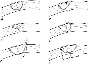 Fig. 5. Effects of suture placement for corneal lacerations. A. For sharp perpendicular wounds, deep suture placement equidistant from the wound margins gives excellent wound approximation. B. Shallow sutures create internal wound gape. C. Full-thickness sutures may create a conduit for microbial invasion. D. Sutures of unequal depth create wound override. E. Sutures of unequal length create wound override. F. For shelved lacerations, sutures should be placed equidistant with respect to the internal aspect of the wound to achieve good wound apposition.