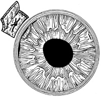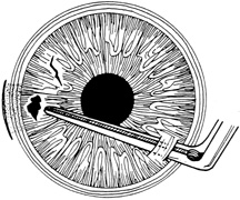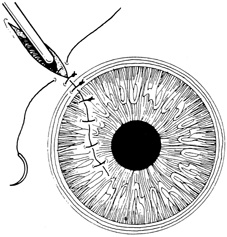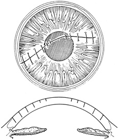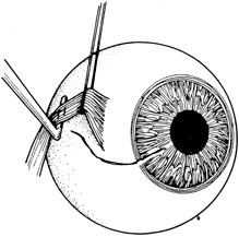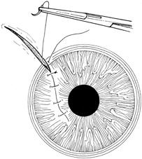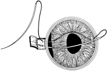 Fig. 23. Iridodialysis repair. A double-armed polypropylene suture with long needles is passed through the iris from across the anterior chamber and is brought out through the ciliary sulcus and tied beneath a scleral flap.