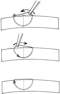 Fig. 10. Suture knot burial. A. Knot is trimmed short and rotated beneath the corneal surface using smooth forceps. B. Direction of knot is reversed, leaving knot end away from corneal surface. C. Knot is rotated back just beneath the corneal surface.