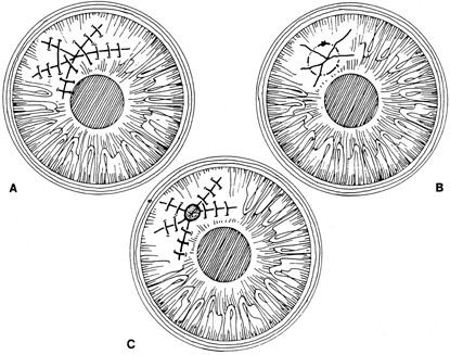 Fig. 11. Stellate laceration closed by (A) bridging sutures, (B) pursestring suture, and (C) multiple interrupted sutures and tissue adhesive.