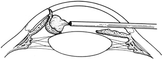 Fig. 24. In the case of a traumatic cataract with a disrupted capsule and vitreous admixture, a bimanual lensectomy is performed using automated microvitrectomy instrumentation.