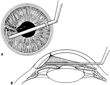 Incarcerated tissue will usually require mechanical reposition. Selected cases of mild incarceration may be treated with pharmacologic agents. Agents such as intraocular acetylcholine or carbachol cause pupil constriction, thus pulling iris from the wound. If incarcerated iris is located in the central cornea, mydriatic agents (e.g., intraocular epinephrine 1:10,000) may be used. If mechanical reposition is required, simply deepening the anterior chamber may release incarcerated tissue. Viscoelastic agents may be irrigated through the paracentesis port or the wound adjacent to the involved iris tissue in an attempt to draw the incarcerated iris from the wound (Fig. 12). If unsuccessful, a cyclodialysis spatula or irrigating canula may be passed through the paracentesis site and used to directly sweep incarcerated tissue free (Fig. 13). Care is always taken to avoid trauma to the corneal endothelium, iris, and lens. Any excised tissue should be sent to the pathology department for examination.