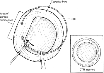 Fig. 14. Capsular tension ring (CTR) is guided into the capsular bag by Y-hook and is directed toward the area of zonular weakness. CTR inserted (inset).
