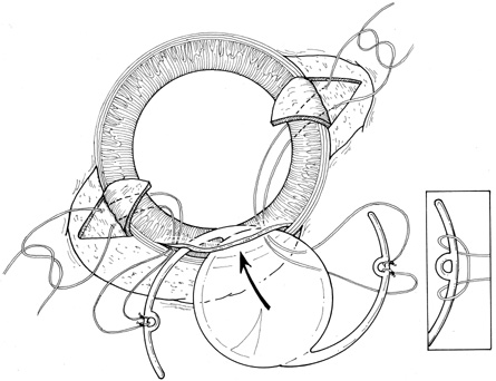 Fig. 15. Placement of a sutured in posterior chamber lens. Scleral flaps are made 180 degrees apart. Suture is either passed through eyelets of the haptics or wrapped around with a girth hitch knot (inset). Needle is placed through the corneal incision, under the iris, and out through the sulcus under the scleral flap.